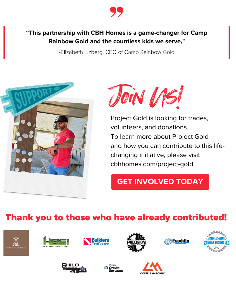 CBH Homes, the largest home builder in Idaho, has announced a groundbreaking partnership with Camp Rainbow Gold, a local non-profit organization. We are going to construct six cabins in just three days for Hidden Paradise, Idaho’s first-ever medical camp and WE NEED YOU!