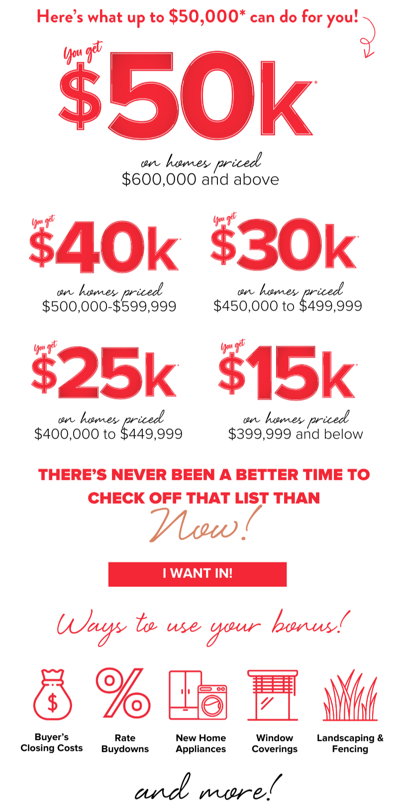 You asked, we listened! We’ve wrapped up your dream home with up $50K* in extras—our holiday gift to you! Cover your closing costs, boost your savings, upgrade appliances, enhance your windows, and so much more.