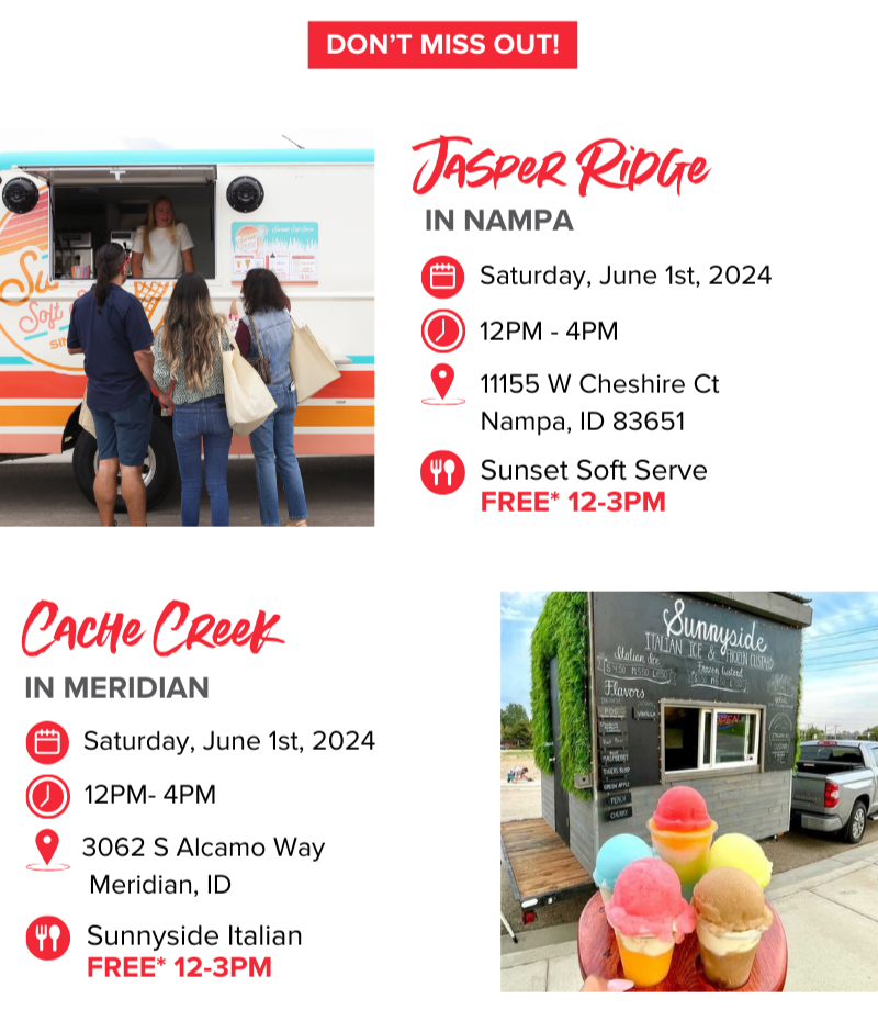 We’re here to help no matter where you are in your home buying journey – and what better place to start than our NEW block party location Jasper Ridge! Come see us at both On the Block locations – Jasper Ridge in Nampa and Cache Creek in Meridian to help with all your burning home-buying questions 12-4pm. Plus, don’t forget to bring your appetite for FREE* food trucks 12-3pm!
