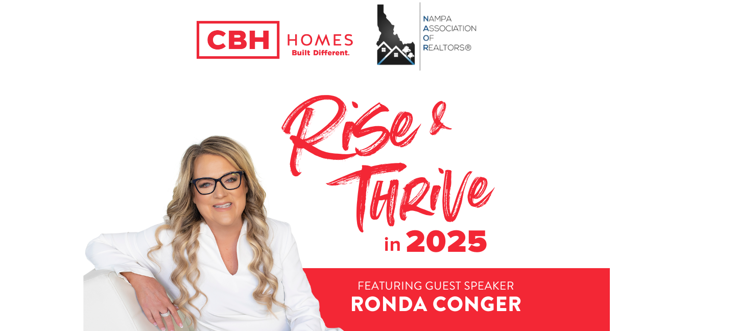 We are so excited to partner with The Nampa Association of REALTORS® to host this tremendous kickoff to 2025! Join us for a morning of highly-anticipated speakers, including our very own Ronda Conger, who will guide and motivate us to a very successful year! Plus, lunch will be provided!