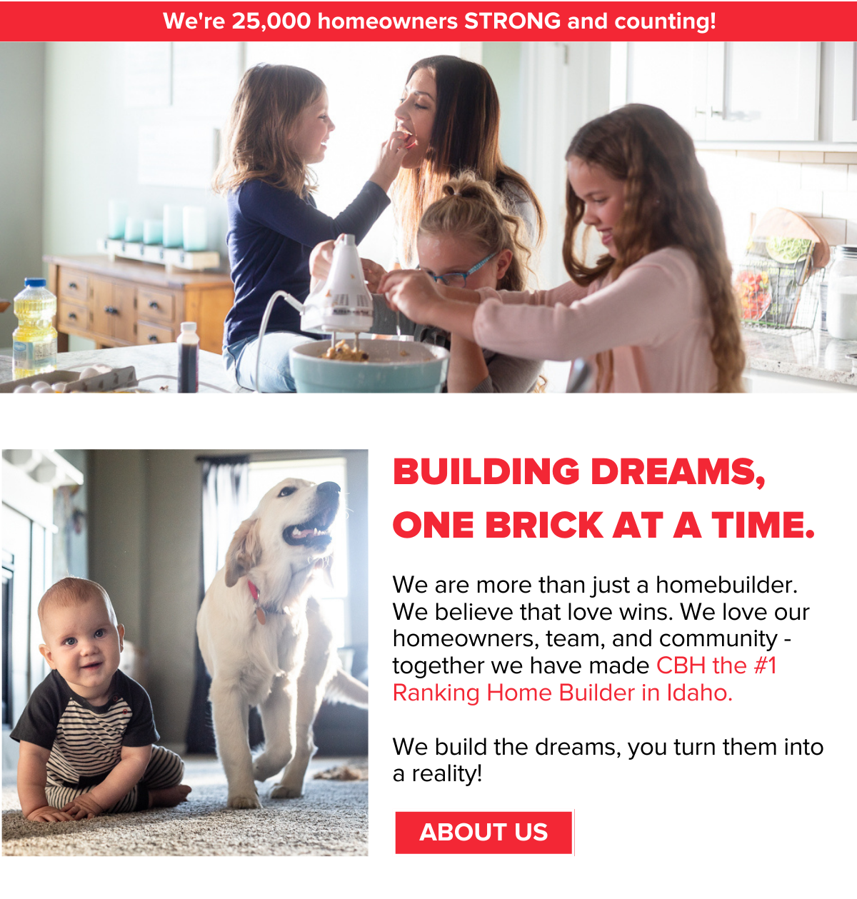CBH Homes has been building dreams for Idahoans for over 31 years, and for 19 of those, named Idaho’s #1 Builder. CBH Homes is also an Idaho Best Place to Work, now ranked #48 in the nation and proudly working with over 25,000 happy homeowners. New homes available now in Boise, Idaho and surrounding areas. Start shopping today, click here!