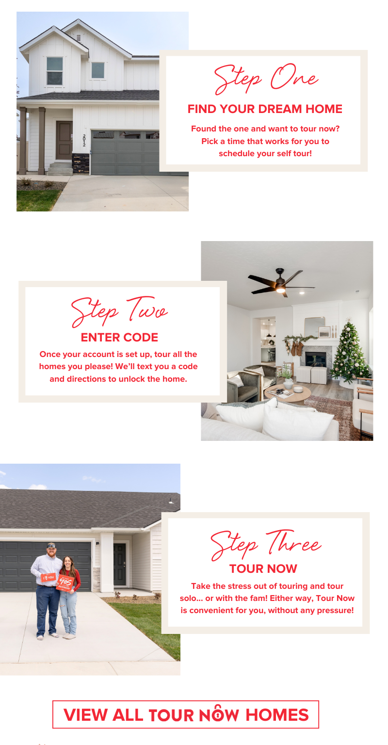 Get instant access to homes in Boise, Meridian, Nampa, Kuna, Caldwell, Star, or Mountain Home – because house hunting should be on YOUR schedule. No pressure, just pure convenience with our keypad-accessible CBH Tour Now homes.