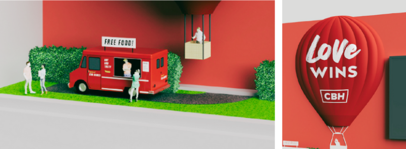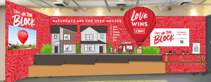 The remodel will include some of our favorite things: lots of RED, furnished model homes, a food truck, and our own 3D Love Wins hot air balloon! Imagine a fun-sized street scene of our popular CBH On the Block event. You’ll still enjoy lots of places to sit, relax and charge your devices before (or after) your flight. Enjoy a sizzle reel showcasing move-in-ready CBH homes and find QR codes throughout as an easy way to contact our team.